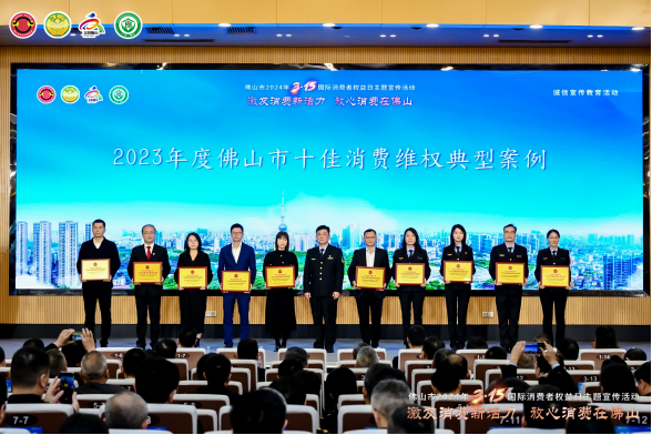 活動現(xiàn)場還為2023年度佛山市及市場監(jiān)管系統(tǒng)的十佳消費(fèi)維權(quán)典型案例承辦單位、十佳消費(fèi)維權(quán)辦理能手,“放心消費(fèi)承諾”“線下無理由退貨承諾”單位,以及市級消費(fèi)教育基地單位等授牌。