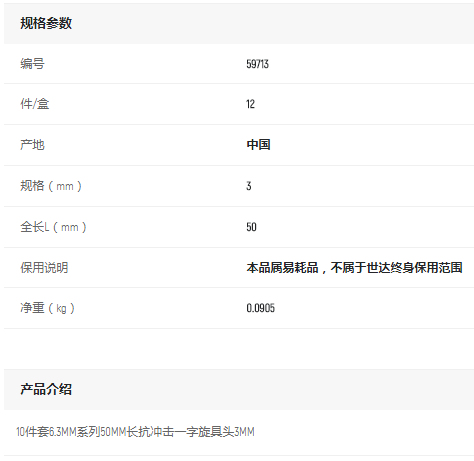 產(chǎn)品名字:世達(dá)10件套6.3MM系列50mm長一字旋具頭3MM